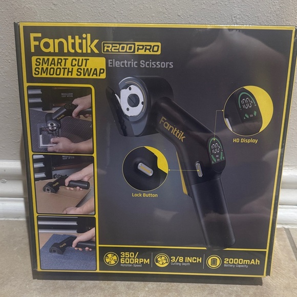 Fanttik R200 Pro electric scissors with HD display. Features smart cut and smooth swap technology. Includes lock button for safety.