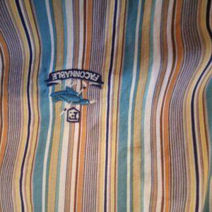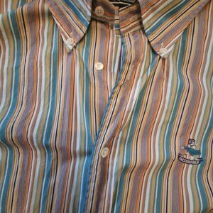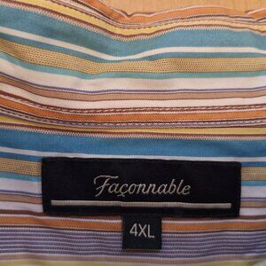 Give your wardrobe a twist of color and style with a Façonnable dress shirt.. We present our most iconic styles alongside innovative designs. Façonnable is generally considered an accessible luxury / high-end brand, known for its timeless style, high-quality craftsmanship, and blend of classic tailoring with modern design. Very trendy with men in Europe for work, dress and smart casual. The brand was founded in Nice, France by Jean Goldberg in 1950. The colors are a classy blend of turquoise, yellow, brown, beige, navy and orange stripes.