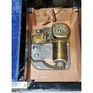This musical jewelry box from Japan is beautifully hand painted inside and out. It has a stamp on the bottom that says "Swan Japan" and the sticker says "Far East Oriental Musical Jewel Box". There is some missing paint and damage to this box, but it is all structurally there and still plays music. It is 6" long, 4" wide and 3.75" tall. It does have a beautiful silver tone lock, but the key is missing. It has a blue lining that is in great condition along with a lid that pulls off with a smaller drawer underneath, and the drawer can be removed to reveal the music box.