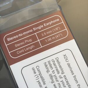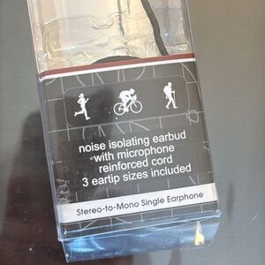 Stylish black and silver wired single earbud featuring a built-in microphone. Perfect for music and calls. It’s missing the various size eartips. Tested and working! I did not stick it inside my ear. 😂