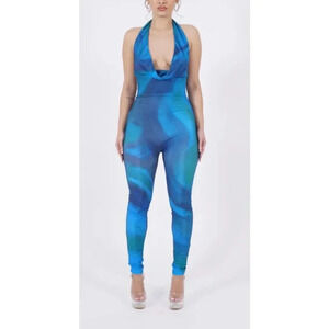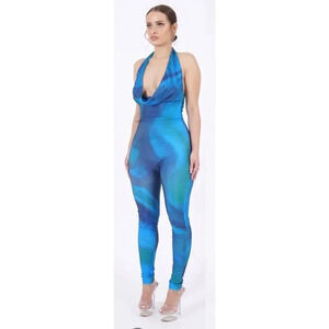 Cloaked with a psychedelic wash of colours, the Alana jumpsuit harks back to the days of disco with its form fitting cut and plunging neckline.