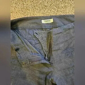 Farhi by Nicole Farhi Linen Blend Blue/Navy Trouser, Size 2. Wide Leg linen blend pants with hook and eye, button and zipper closure. No front pockets and 1 back flat pocket. There is a white circular discoloration on the back left leg. See photo. Otherwise, it's very good condition!
