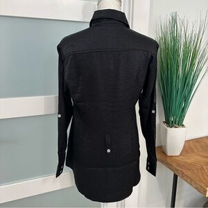 Farinaz Taghavi Adventure Tunic Blouse SZ 4 Black Roll Tab Sleeves Shiny NWT