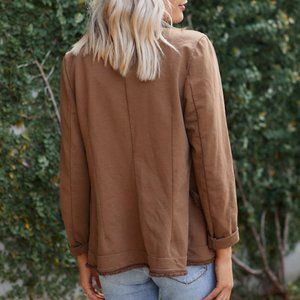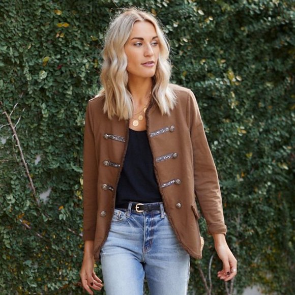 Military style jacket that features rhinestone embellishments throughout, cuffed sleeves, and an open drape front. Model is Wearing a Size S. Never worn