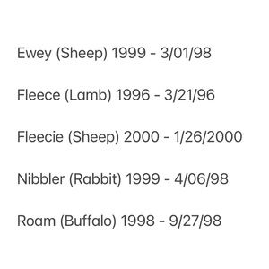 ![Farm Babies! [2/$25 - 3/$30] Ty Beanies: Derby Ewey Fleece Fleece Nibbler & Roam - Picture 3 of 13](https://di2ponv0v5otw.cloudfront.net/posts/2023/11/01/6542a6cabe296b48b7b2f59b/m_6542b45c2fbf1a25a2a5f211.jpeg)