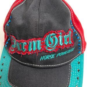 Farm Girl Horse Powered Womens Red Aqua Hat Cap with Rhinestones One Size
