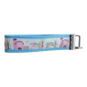 These wristlets feature a farm scene with a pink barn, silo, chicks, cows and pigs. The blue cotton webbing coordinates nicely and adds a nice pop of color. The hardware and keyring are silver in color.