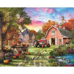 A detailed 1000-piece puzzle featuring a vivid farm scene with high-quality large pieces. Includes a finished size of 24"x30". Made in the USA.