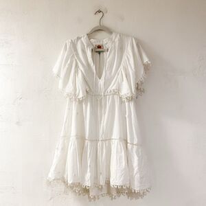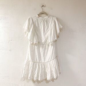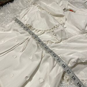 SO cute and in good preowned condition! White cotton dress fully lined. Trimmed in white eyelet. Appliquéd flowers throughout. Ties at waist. Tiered skirt. Flounce sleeves.