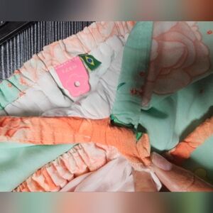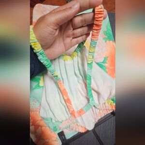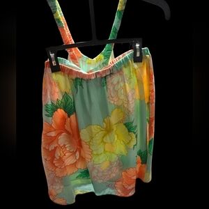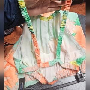 Farm Rio Vibrant colored dress with floral patterns. Features shades of green, orange, and yellow. Perfect for a sunny day.