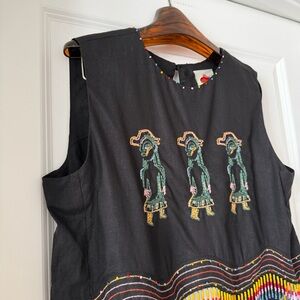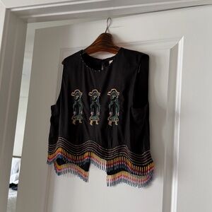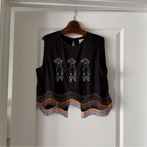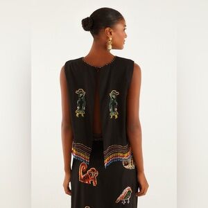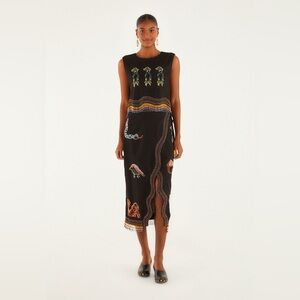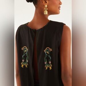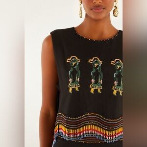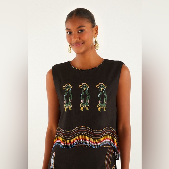 The Ana Leovy Farm Rio Figures top captures playful charm with its rich black canvas adorned by vibrant embroidered figures and colorful beaded fringes that dance along the hem. Its cropped silhouette with a delicate round neckline, lightly decorated with tiny beads, offers a perfect balance of comfort and artistry. Crafted from eco-friendly Lenzing Ecovero and Euroflax fibers, it blends sustainability with exquisite texture and breathability, inviting warm, joyful wear.