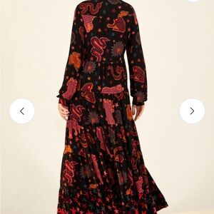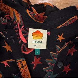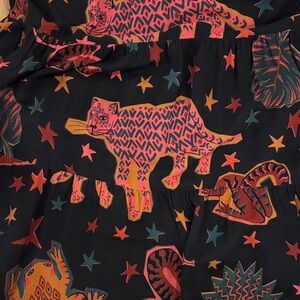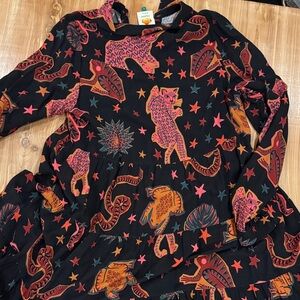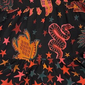 Vibrant button-up shirt dress with a unique pattern. Features shades of red, orange, and black. Farm Rio Animal Sky Maxi Dress