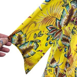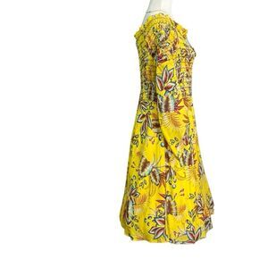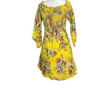 Bright and bold smocked dress by Farm Rio for Anthropologie. Features off-the-shoulder neckline, side zipper, and vibrant tropical print. Bust: 20” unstretched. Length: 40”. Excellent condition—perfect for summer, resort, or vacation style.
