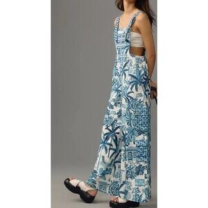 Farm Rio Anthropologie Denim Overalls Women Blue Floral Vacay Retro Boho Large