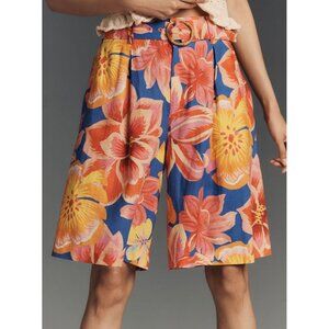Farm Rio Anthropologie Linen Blend Belted Floral Bermuda Shorts Size XL