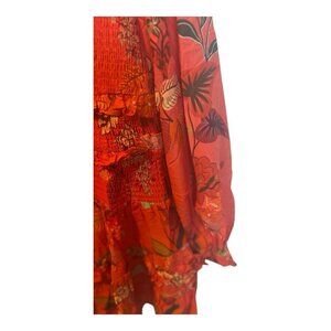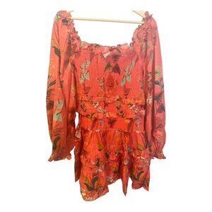 Farm Rio Anthropologie Smocked Ruffle Mini Dress Large Coral Long Sleeve