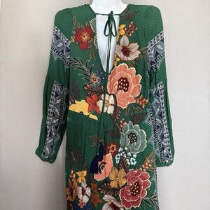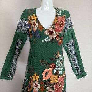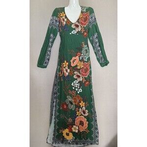 Farm Rio Anthropologie Verdor Maxi Dress Medium Green Floral Long Sleeve V-Neck