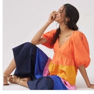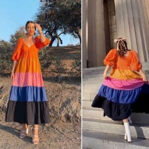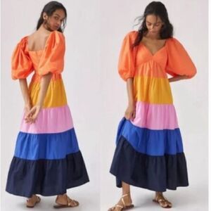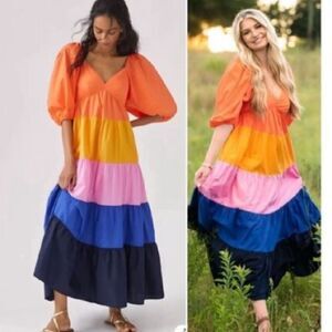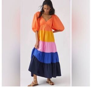Farm Rio Anthropologie Women’s Size XS Tiered Color Block Maxi Dress Rainbow NWT