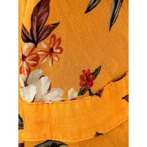 Turn heads in this Farm Rio for Anthropologie boho-chic wrap maxi dress, featuring a golden yellow/orange base with bold floral prints, a flowy wrap silhouette, and a vibrant tiered hem with red and patterned accents.