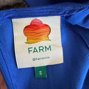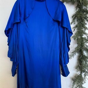 Elegant blue mini dress by FARM Rio. Features flowing sleeves and beaded buttons. Worn once for a holiday party