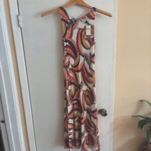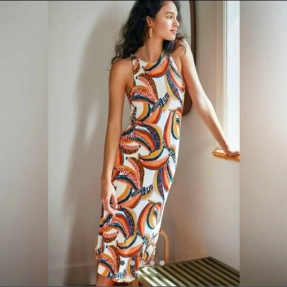 This is a new, never worn Farm Rio dress from Anthropologie. Background of the dress is an off-white, close to cream color. The fabulous abstract banana print features various colors, including black, making it easy and fun to style/accessorize with. The dress is a stretchy, form fitting material. It's a versatile style as it could be worn with sandals or sneakers for a casual look or elevated with heels/espadrilles/ wedges.