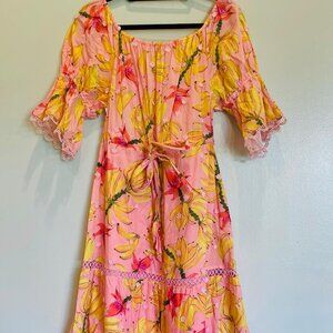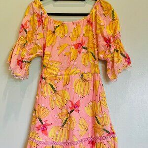 Vibrant and playful midi dress from Farm Rio featuring a unique pink background with yellow banana and tropical floral print. Designed with a flattering off-shoulder neckline, bell sleeves, a self-tie waist, and a tiered skirt with delicate lace trim.