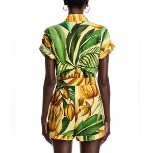 The perfect outfit choice when you you need something quick to throw on and still want to look efforlessly cool. Unleash the vibrant charm crafted from 100% linen in a captivating yellow banana tree print. Stylish romper boasts short sleeves, a fold collar, and front button closures, completed with two slant pockets and two buttoned-flap pockets at the chest. Designed with cuffed hems and a darted waist. Includes a matching belt for a flattering fit. Proudly made in India. B Corp certified, ensuring a positive social and environmental impact. Measurements include a 3" inseam and a 25" leg opening. Hand wash.