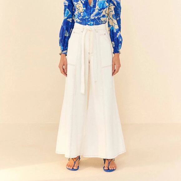 Farm Rio's pants are crafted of heavyweight twill and feature a wide-leg silhouette. Contrast stitching and a self-tie belted waist complete this high-rise style.