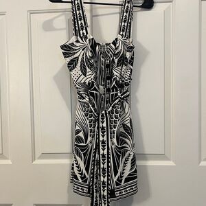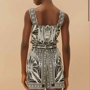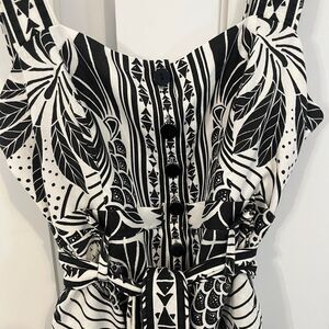 Farm Rio black and white romper - floral pattern. Button front and tie belt. Original tag is missing, though replacement button in bag is still attached. Never worn.