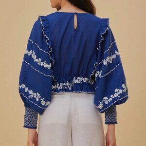 Gorgeous royal blue blouse with white embroidery. Ruffle and stunning sleeves with intricate cuffs. Soft fabric. Dressed up or down. Good condition. Lovely piece.