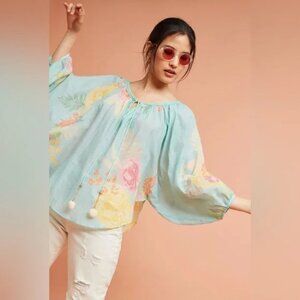 Farm Rio Blue Green Basel Peasant Blouse 100% Cotton Floral Blouse