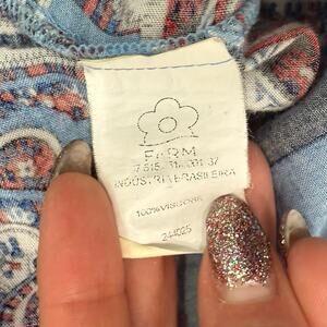 A vibrant Farm Rio mini dress featuring a sky blue base with maroon and white paisley patterns. Designed with long sleeves, button cuffs, and a full front button closure that ends in a playful ruffled hem. Made from soft 100% viscose (materials tag shows some wear). Effortlessly chic and perfect for seasonal transitions.