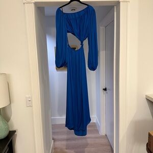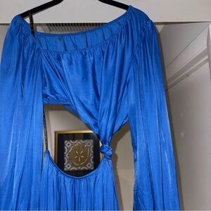 Farm Rio Blue Satin Long Sleeve Cut Out Knot Royal Blue Midi Dress Sz Small NWT