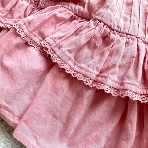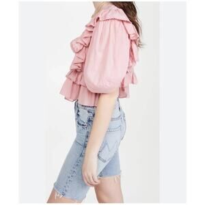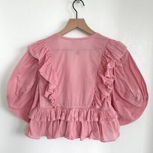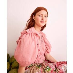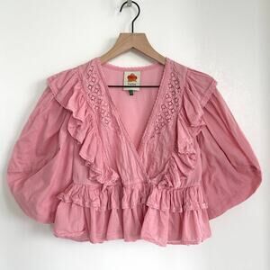Farm Rio Blush Pink Puff Sleeve V-Neck Cropped Bohemian Blouse Size XS V-neck Lace and pintuck details at bodice Elbow length puff sleeves Ruffle edges Peplum hem Hidden snap button closure 100% Cotton Great preowned condition Very faint mark on bottom front hem but not noticeable and covered with another layer. Please check our all photos. Approx. measurements laying flat: Pit to pit 17" Waist 15" Length 17" Tags: summer, spring, boho, bohemian, ruffle, balloon sleeve, puffed shoulder, wrap top, garden, picnic, party, cocktail, event, wedding guest, vacation, beach, travel, resort, brunch, date, night out, daily, dopamine, pink, barbiecore, fairycore, premium, anthropologie, cotton, linen, lightweight, breathable, cute, elegant, romantic,