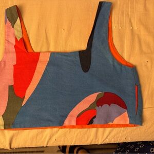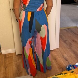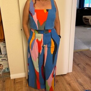 Vibrant two-piece set with abstract print. Features a sleeveless top and wide-leg pants. Perfect for a bold fashion statement. Please note that the pants are XL and top L