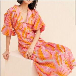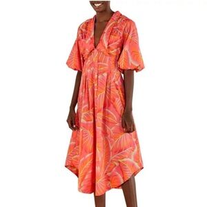 Details: Oversized, Wide scalloped collar, button down, midi length, breast pockets, waist pockets, balloon sleeves, pleated waist