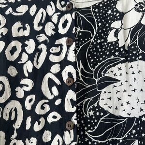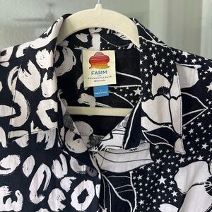 Beautiful dual pattern black and white button down top from Farm Rio (for Anthropologie). Wooden style buttons. Size small, 55% linen, 45% viscose. Please feel free to free to ask any questions. Thank you!