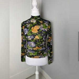 Floral Print Mock Neck Top. A vibrant long-sleeve top featuring a striking floral print in shades of purple, green, and yellow against a black base. Designed with a sleek mock neckline and ruched detailing for a flattering, fitted silhouette. Perfect for pairing with tailored pants, denim, or a skirt for a polished day-to-night look.