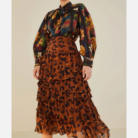 Farm Rio Caramel Maxi Leopard Frill Ruffle Skirt Brown/Black Size XL NWT
