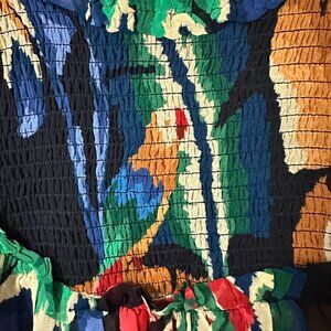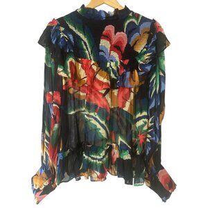 Farm Rio Chevron Forest Black Blouse Size Small, Boho, Festival, Floral, Statement, Smocked, Ruffles, Sem-Sheer, Voluminous Sleeves