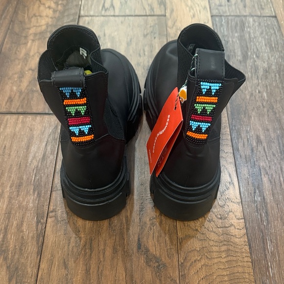 Black platform Chelsea boot. Elastic side panels for easy slip-on. Decorative beaded pull tabs with orange, blue, green, pink and yellow accents. Chunky lug sole for an edgy look.