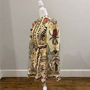 Buttons down the front. Removable belt with beaded buckle. Lined.
