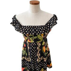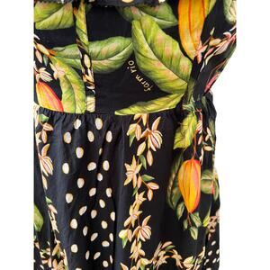 New Farm Rio Cocoa Paradise Dark Botanical Print Mini Dress, size S. Farm Rio designs colorful pieces with lighthearted inspiration. This Dress features a boned corset style bodice with Vibrant cocoa pods and tropical blossom print, ruffle cap-sleeves and a square neckline crafted from breathable 100% cotton to keep you cool on warmer days. Fun playful print!