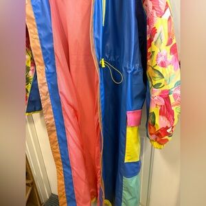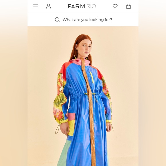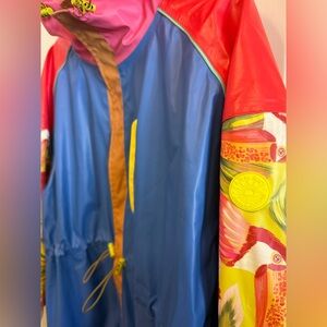 Farm Rio Colorblock full-length long raincoat 🤩 Seriously amazing, brightly colored and tropical motif complete with toucans, leaves, and flowers.