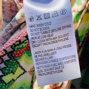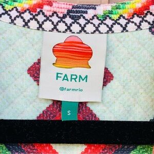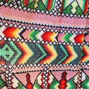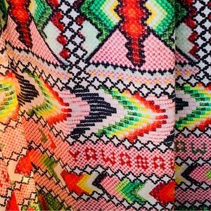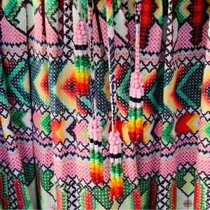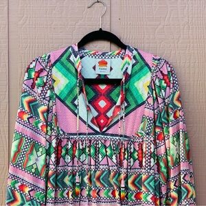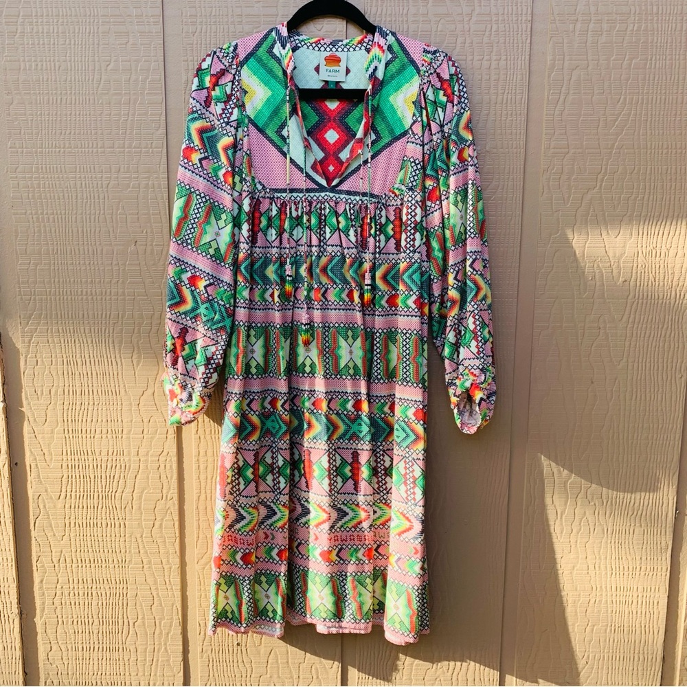 Farm Rio Vibrant dress featuring a geometric pattern in green, pink, and red. Perfect for adding a pop of color to your wardrobe. Beaded ties.