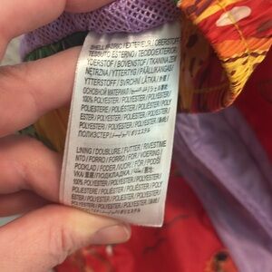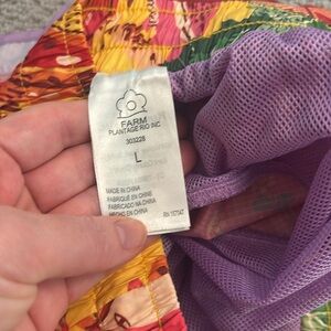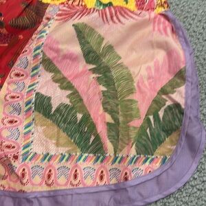 Vibrant shorts with a mix of red, purple, and yellow patterns. Features a drawstring waist and unique design.