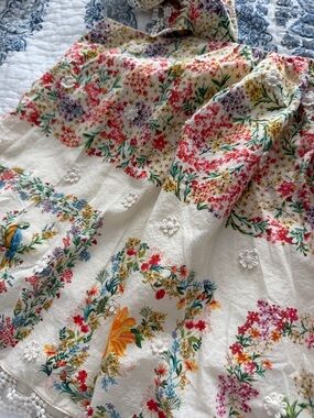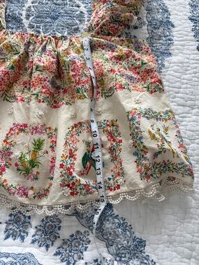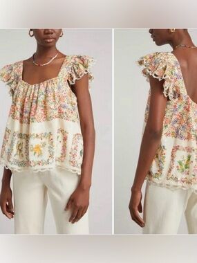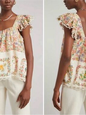 Lightweight cream top with colorful floral and bird print. Elastic ruffle sleeves and crochet-trim hem for a charming look. Soft, breathable fabric perfect for everyday wear and warm-weather outings.