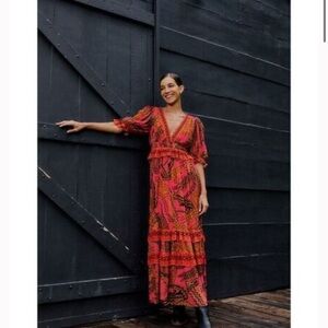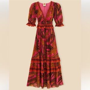 New with tags attached Farm Rio Croco Pink maxi dress Ballon elbow length sleeves with elastic cuffs Vneck Animal print with vibrant hues Elastic at waistline Flowy skirt with ruffles Invisible zipper at side seam