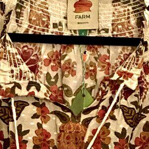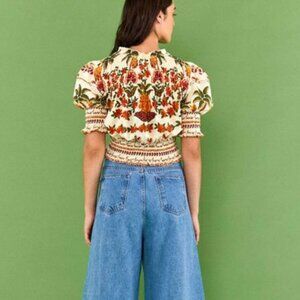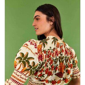 Farm Rio Crop Floral Top Wm Sz S Smock Waist Short Puff Sleeve Tie Neck NWT