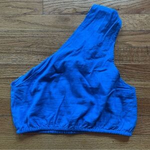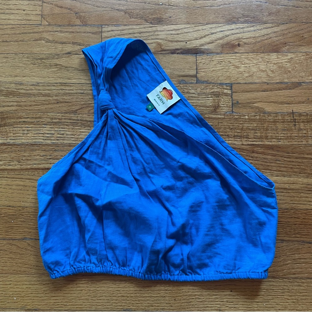 Beautiful blue Farm Rio top. Inside tag is cut out, but it feels like linen. One shoulder cropped - you can tuck the bottom part up to make it more of a bra. Great condition.